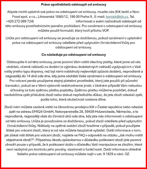 - KiK textil a Non-Food spol. s r.o., Lihovarská 1060/12, 190 00 Praha 9 , e-mail: kontak@kik.cz, Tel. +420 272 089 724):